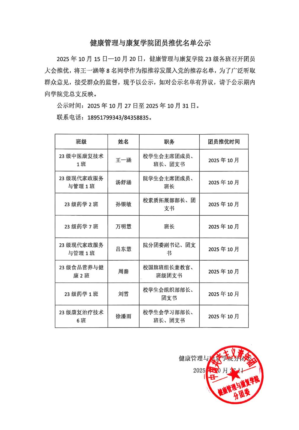 健康管理与康复学院2025年团推优入党名单公示