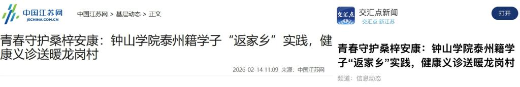 近日,中国江苏网、新华日报交汇点等媒体报道我校泰州籍学子“返家乡”实践,健康义诊送暖龙岗村。全文如下: