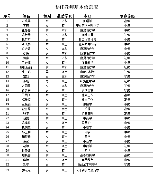 学院现有专、兼职教师97名,其中高级职称占比15.6%,拥有博士、硕士学历占比71.9%,双师型占比77.1%。主要专业先后由来自省内以高等医药院校和三甲医院为主的国内乃至国际著名专家、校内外业内资深教授及团队领衔建设。其中:智慧健康养老服务与管理和现代家政服务与管理专业由本校业内资深专家、原副校长单奕教授领衔建设和指导;康复治疗技术专业由中国康复医学会康复治疗专业委员会副主任委员、南京医科大学康复医学院副院长李勇强教授领衔建设和指导;食品营养与健康专业由南京中医药大学郭胜伟研究员领衔建设和指导;药学专业由中国药科大学博士生导师余伯阳教授等领衔建设和指导;中医康复技术专业由南京中医药大学针灸推拿学院养生康复学院副院长吴云川教授等领衔建设和指导;体育保健与康复专业由南京体育学院运动康复专业的资深专家领衔建设和指导。